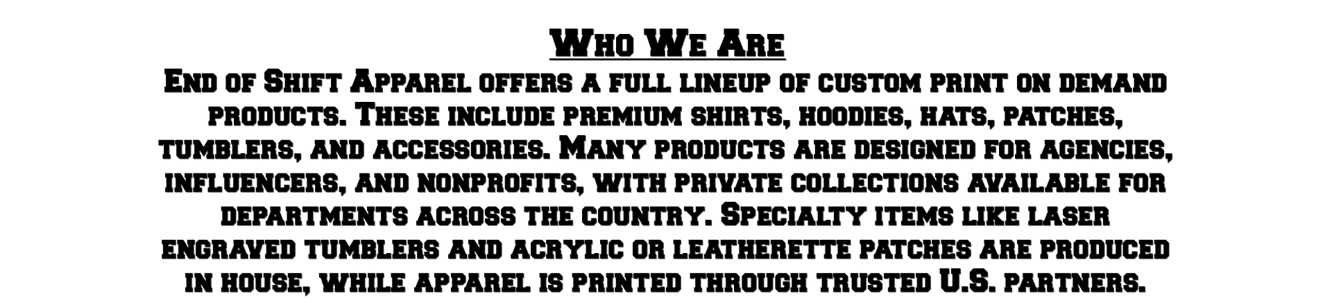End Of Shift Apparel is proud to be partnered with Sad Team Six. Their mission is to use laughter to raise awareness and break the stigma around mental health challenges experienced by public safety professionals and military service members with a focus on PTSD and suicide prevention.